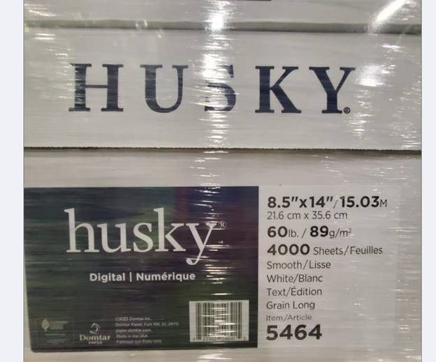 [20] La Pièce B de l’Affidavit Jackson contient des images représentatives des étiquettes apposées sur l’emballage des rames de papier et les cartons de papiers. Mme Jackson confirme que les images contenues à la Pièce C sont représentatives de l’emballage utilisé depuis au moins 2007 en liaison avec la marque de commerce HUSKY Digital. Un examen des images à la Pièce B montre que la Marque HUSKY est présentée séparément de l’élément nominal descriptif.